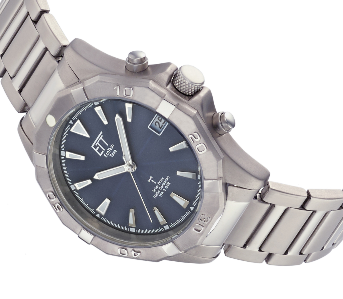 Eine sportlich elegante Herrenuhr mit blauem Ziffernblatt und Solar-Funk-Antrieb, sowie Datumsanzeige. Die Eco Tech Time Solar Drive Alaska Damenuhr hat bis zu 6 Monaten Dunkelgangreserve. Das Gehäuse und das Armband der Eco Tech Time Solar Drive Funk Alaska sind aus Titan.
