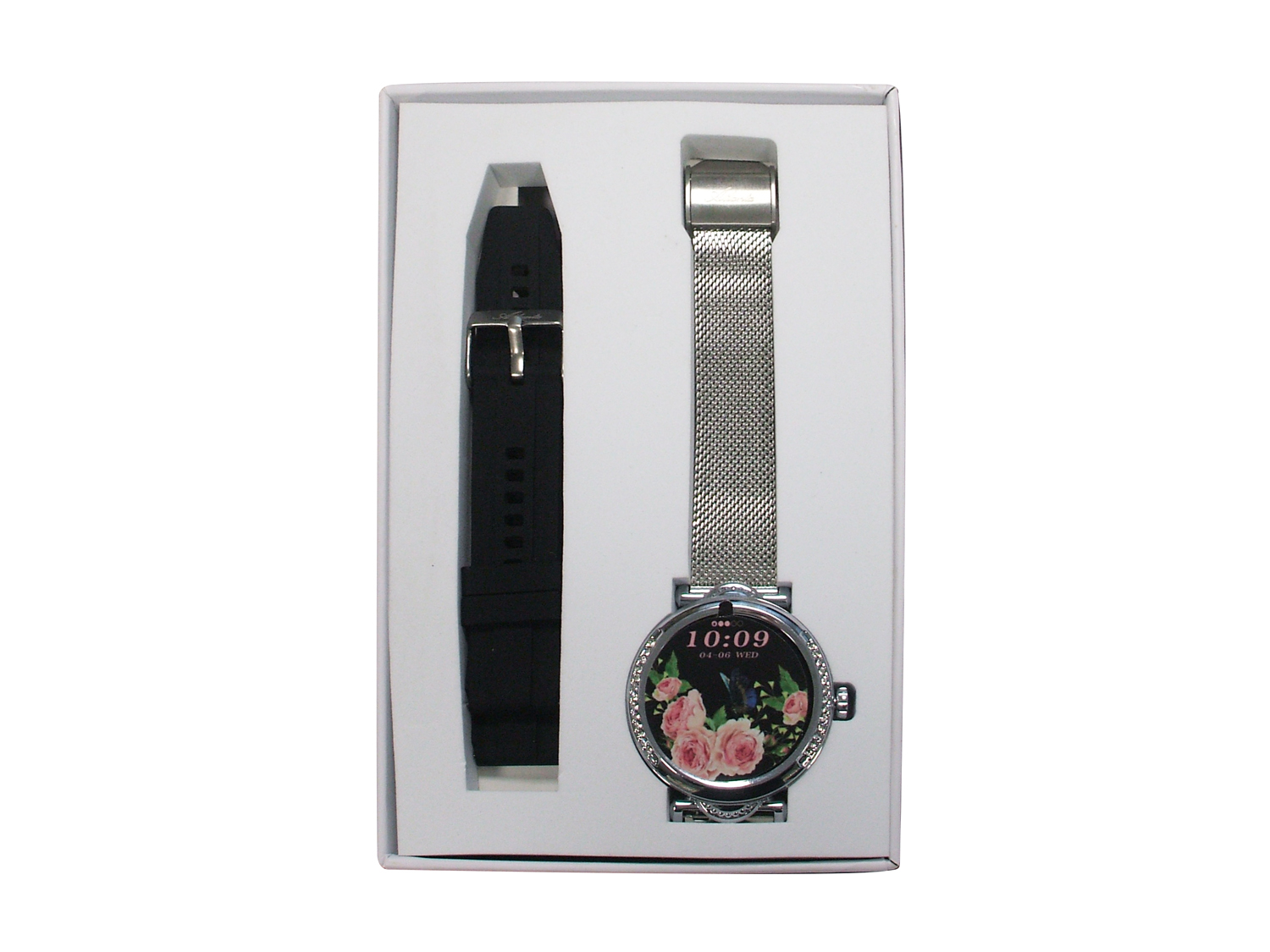 • Lieferumfang: 1 Smartwatch silberfarben, Meshband silber + extra Silikonband schwarz + 1 Ladeclip USB + Bedienungsanleitung