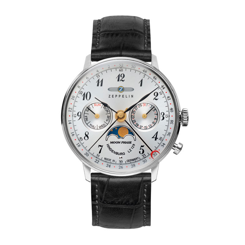 Poliertes Edelstahlgehäuse; silberfarbenes Zifferblatt mit schwarzen Zahlen und Zeigern; Quarzwerk; Zentralsekunden-, Datums- und Wochentags-Anzeige, Mondphase. Hochwertiges Kunststoffglas, verschraubter Edelstahlboden.