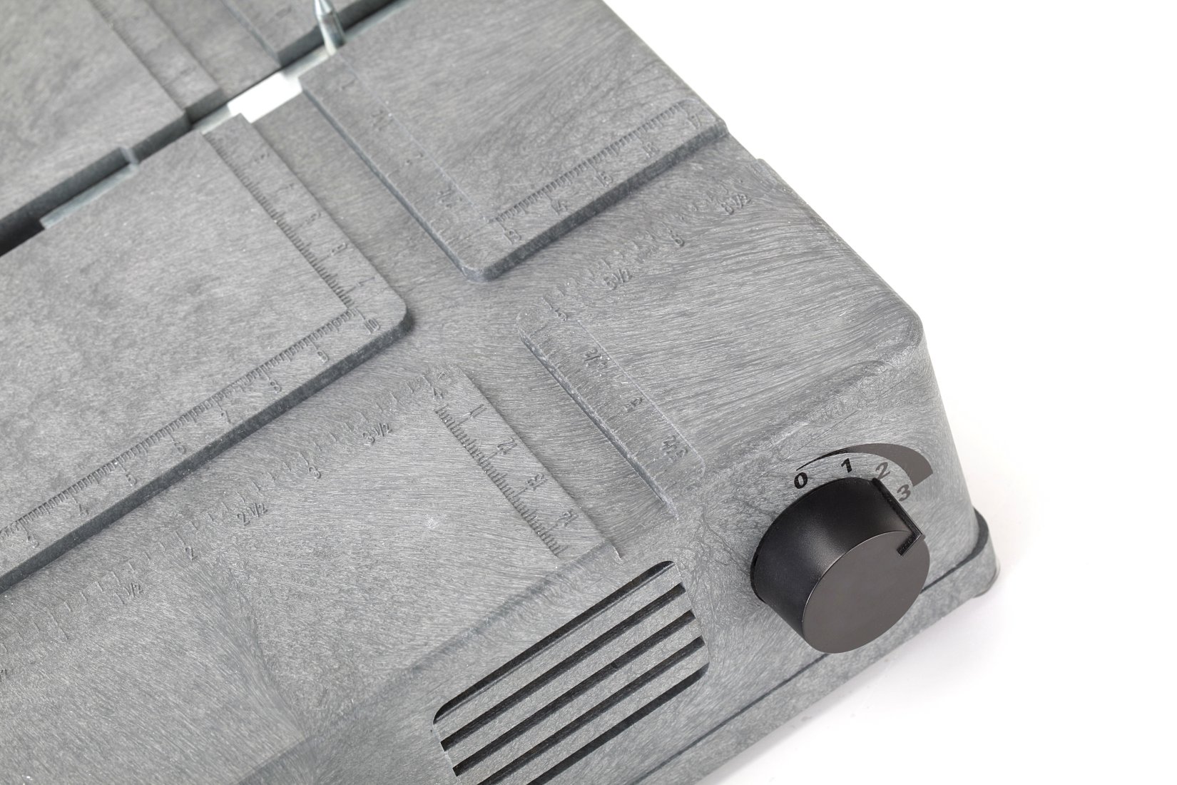 Arbeitsfläche: 350 x 350mm mit Koordinaten (Einstelltabellen), metrich und zöllisch aus schlagfesten, hitzebeständigen Kunststoff.