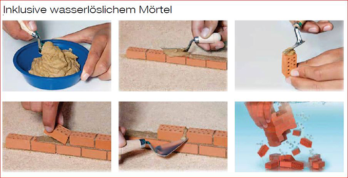 Stein auf Stein bauen, mit echten gebrannten Ziegelsteinen und Mörtel. Aus speziell gereinigtem Ton - 100% Natur. Durch die spezielle Mörtelmischung auf wasserlöslicher Basis lösen sich alle Teile durch Eintauchen in Wasser - somit können alle Ziegel immer wieder verwendet werden.