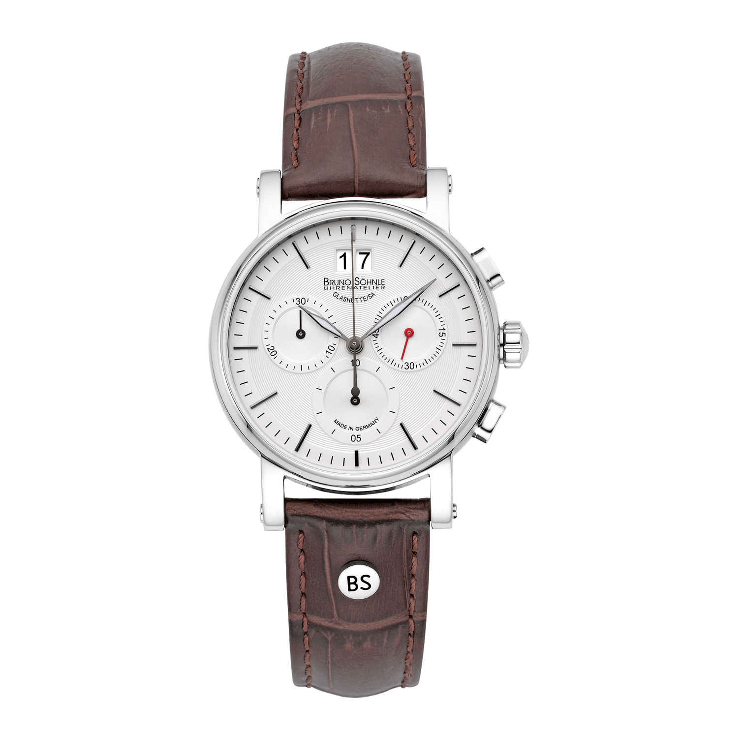 KLASSICH-SCHICK, BETONT WEIBLICH – diese Bruno Söhnle-typische Symbiose verdeutlicht auch der Chronograph PESARO SMALL, der sich durch eine klare Formgebung und eine technisch überzeugende Präzision auszeichnet: Während das mit Indexen und Großdatum bei ‚12‘ versehene Zifferblatt ein modernes Designbewusstsein ausstrahlt – und mit dem robusten Edelstahlgehäuse eine ebenso optisch ideale Einheit bildet –, sorgt im Innern das Quarzwerk für die stete Ganggenauigkeit.