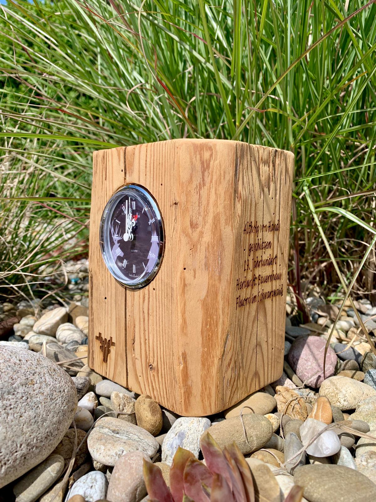Balkenuhr aus Altholz, Maße ca. 110 x 160 x 110mm, circa 800g.