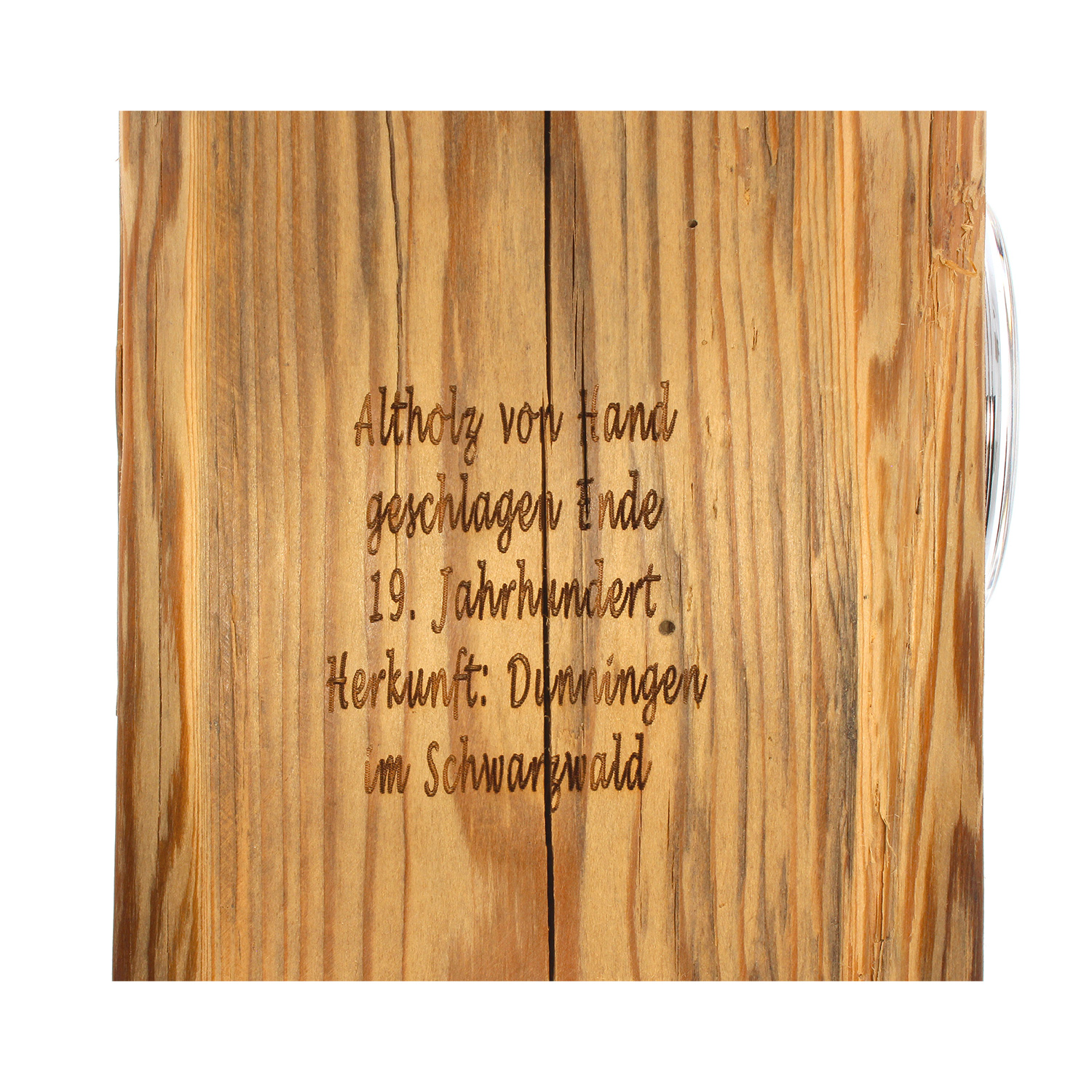 Das massive Holz für unsere Uhren stammt aus dem Schwarzwald, durch einen örtlichen Schreiner wird das Holz aufbereitet und anschließend beschriftet - als Ursprungsnachweis, woher das Holz genau stammt und wie alt es circa ist, z.B. "Altholz von Hand geschlagen, 19. Jahrhundert, aus Dunning im Schwarzwald." Damit ist jede einzelne Uhr nicht nur aufgrund seiner individuellen Masserung und des Zuschnittes sondern auch durch ihre Herkunft ein Unikat.
