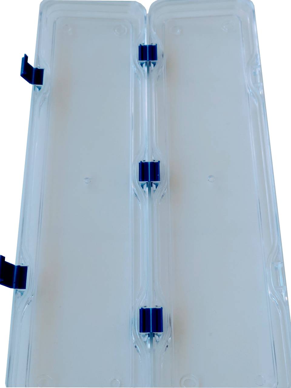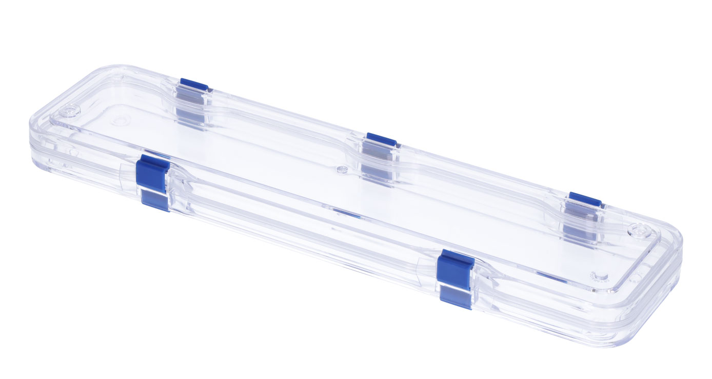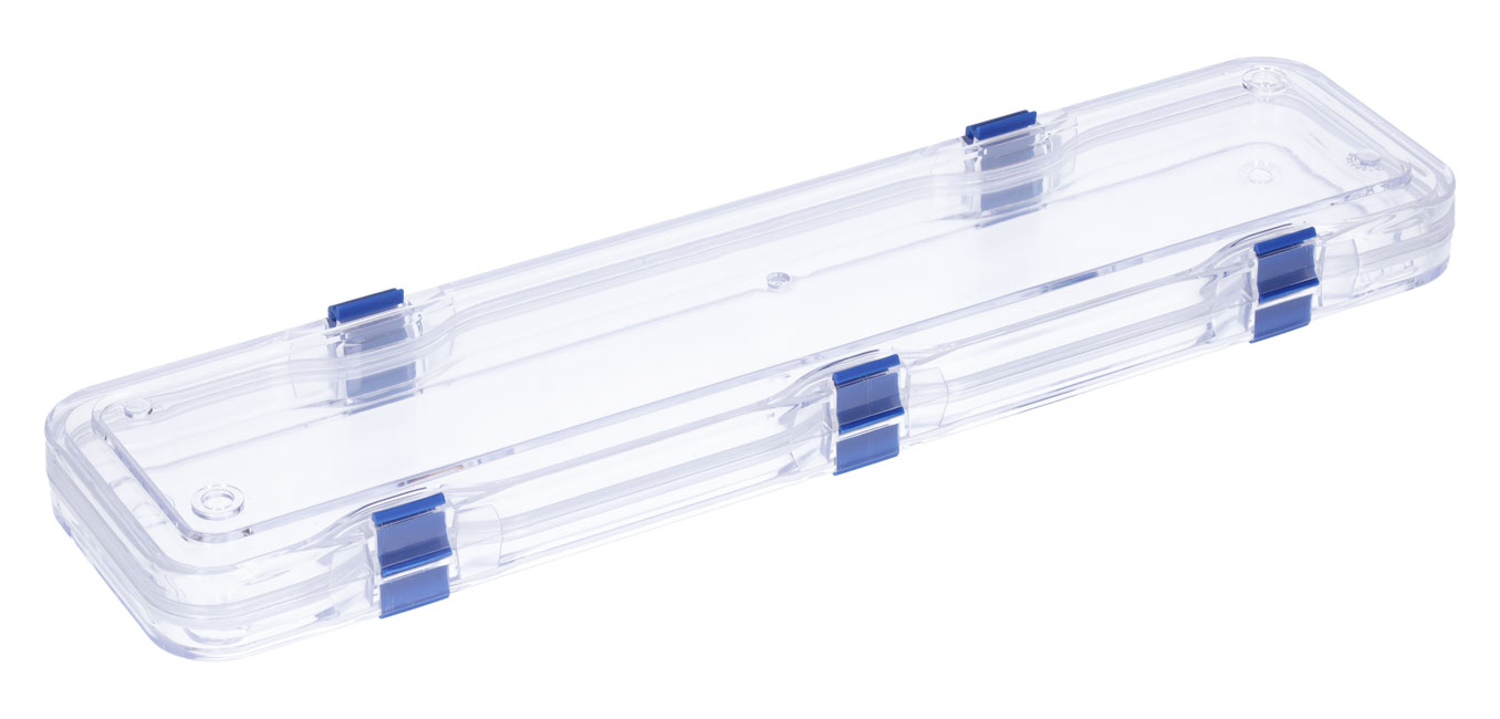 Das Polystyrol ist glasklar, die Scharniere und Verschluss sind blau, die Ecken abgerundet.