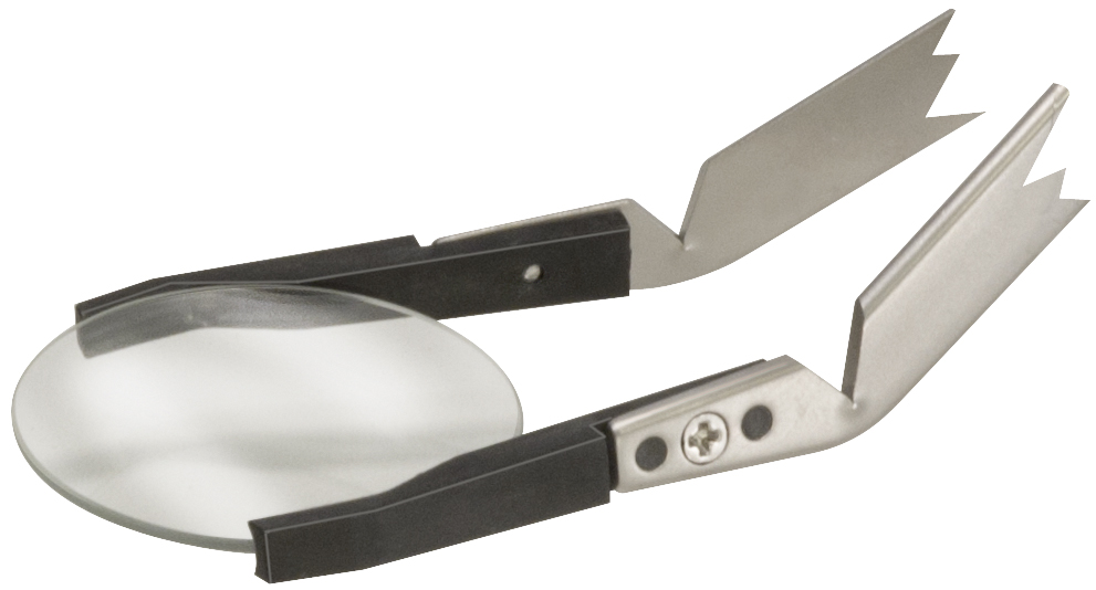 Aus Edelstahl mit Kunststoffspitzen und Rille zum Halten von Gläsern und Zifferblättern.