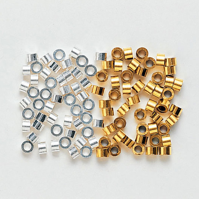 Als Quetschsicherung für Stahlseidenenden. Sortiment mit je 50 vergoldeten und versilberten Röhrchen.
