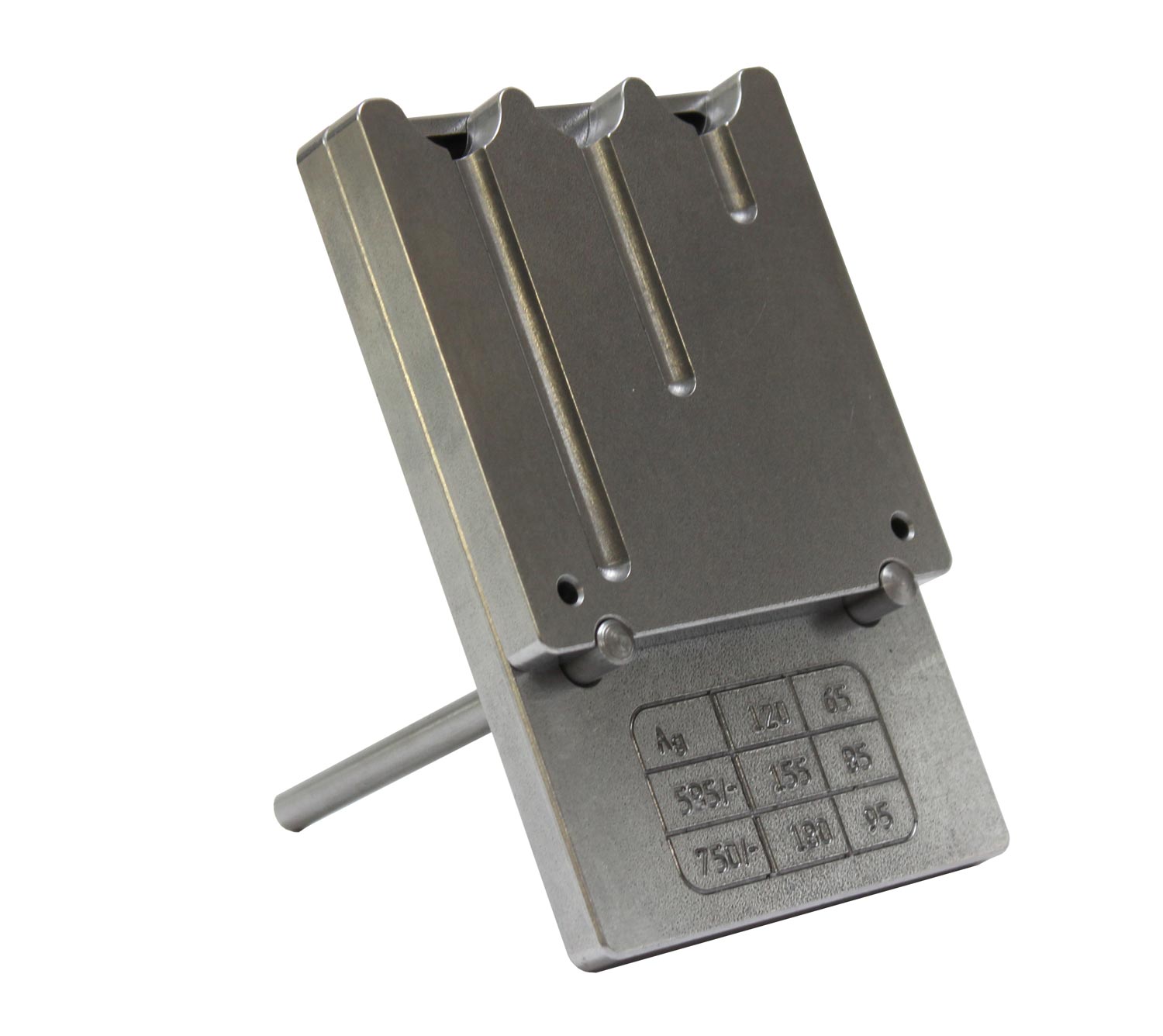 -Zwei Eingüsse für Blech erlauben Güsse bis zu 120g Gold (750er) oder 85g Silber.
