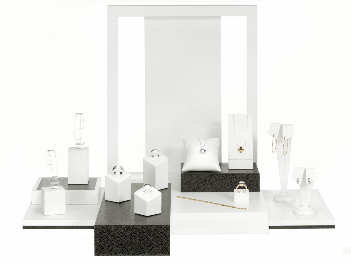 Das Display Set Air besteht aus insgesamt 7 individuell kombinierbaren Elementen und besticht durch sein zeitlos klassiches Design. Die Displays sind aus hochwertigem und robustem MDF gefertigt und teilweise mit Lederimitat in Kroko-Optik bezogen.