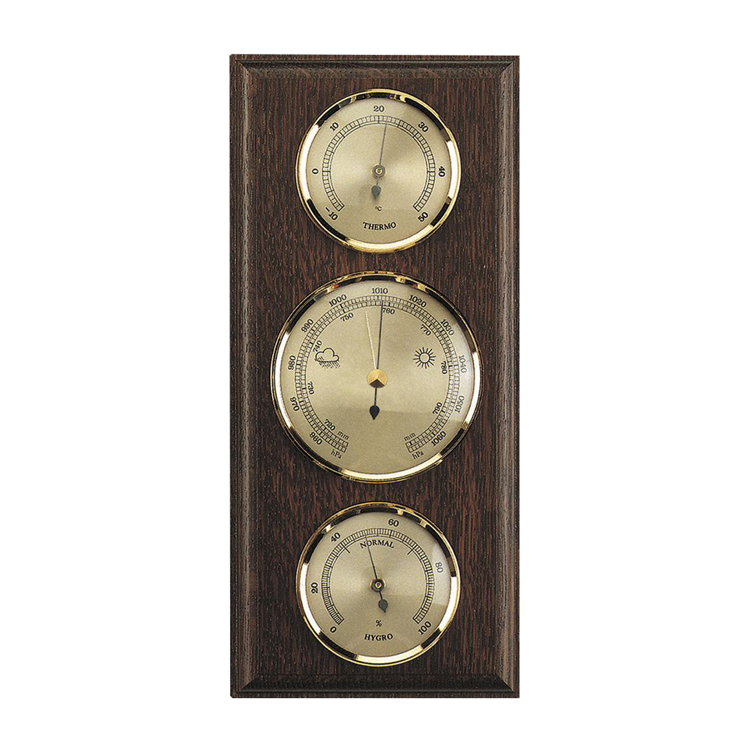Wetterstation mit Barometer (geschlossen), Thermometer und Hygrometer (Bi-Metall), hergestellt aus massiver Eiche (dunkel) und Messingringen in Unterfranken.