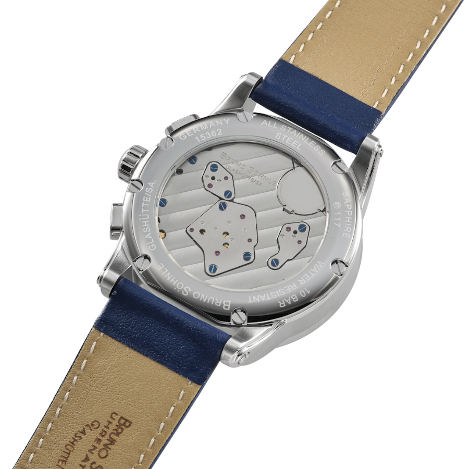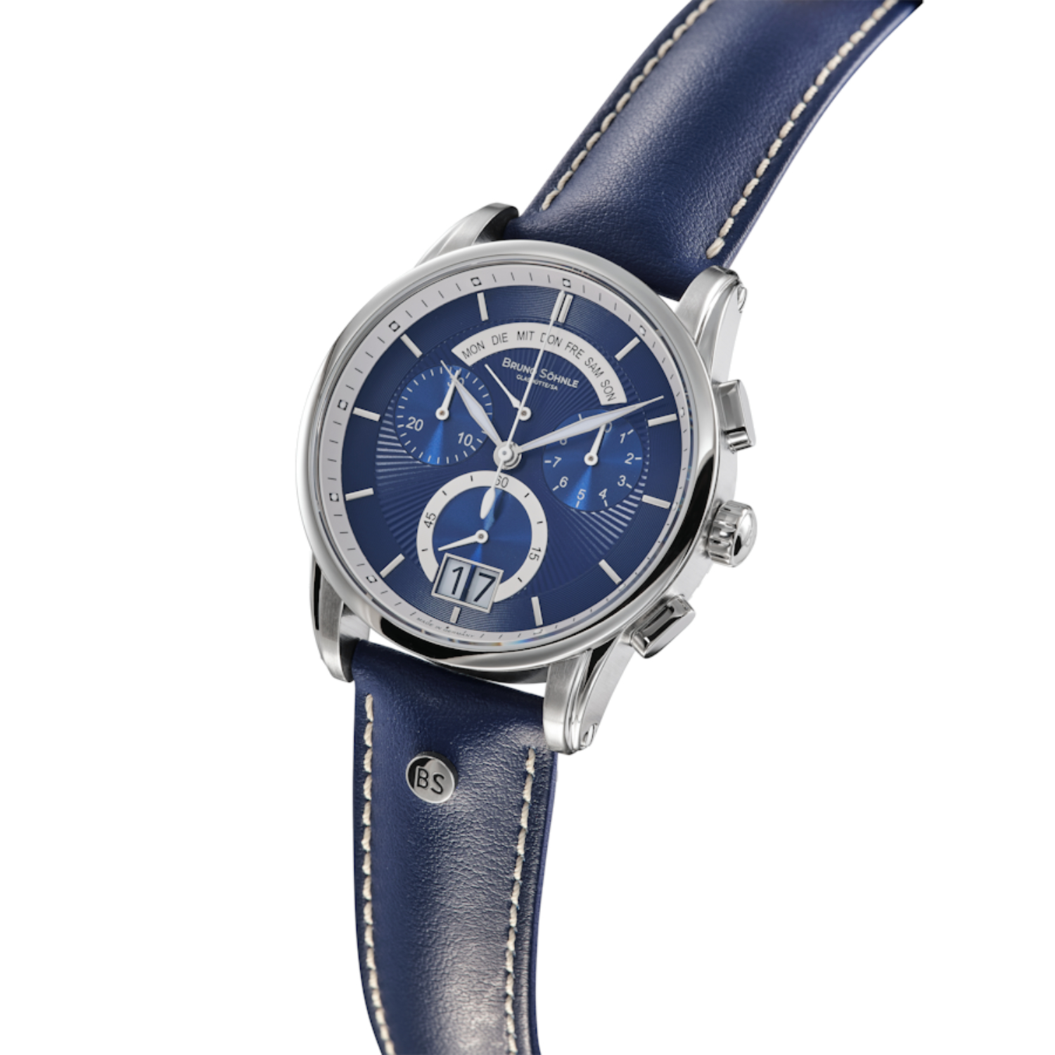Die neue Bruno Söhnle Grandioso bietet, wie für die Modellreihe üblich, sehr viele Funktionen in einer Uhr. Was sofort auffällt sind Großdatum und Tagesanzeige auf 6 Uhr, beziehungsweise 12 Uhr. Das verzierte Zifferblatt in schönem Dunkelblau spielt geradezu mit dem Licht und passt hervorragend zu dem blauen Lederarmband.