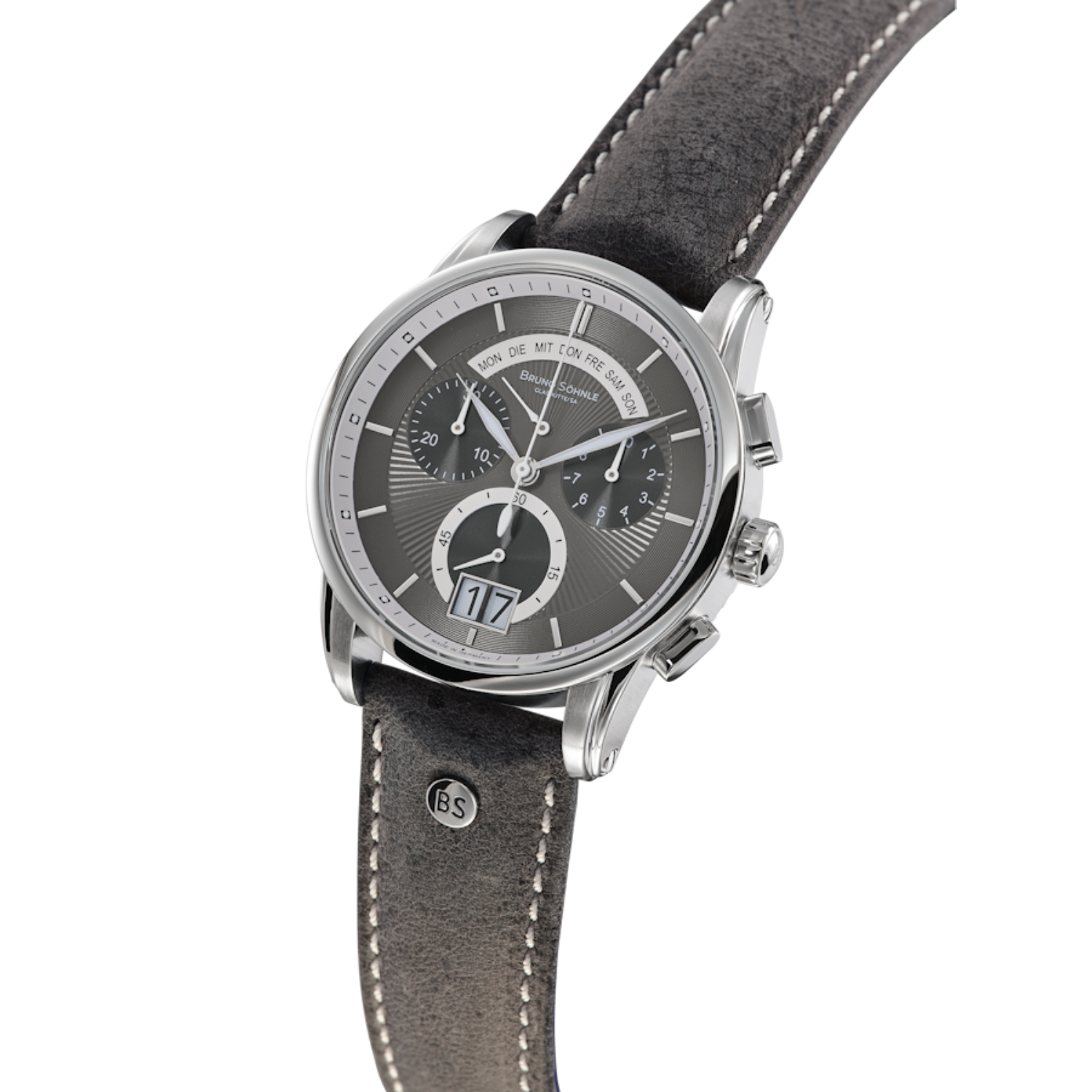 Die neue Bruno Söhnle Grandioso bietet, wie für die Modellreihe üblich, sehr viele Funktionen in einer Uhr. Da wäre das Großdatum auf 6 Uhr, die Tagesanzeige auf 12 Uhr und natürlich die Chronographenfunktion selbst. Das verzierte Zifferblatt in gedecktem Grauton spielt geradezu mit dem Licht und passt hervorragend zu dem grauen Lederarmband.