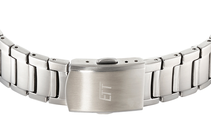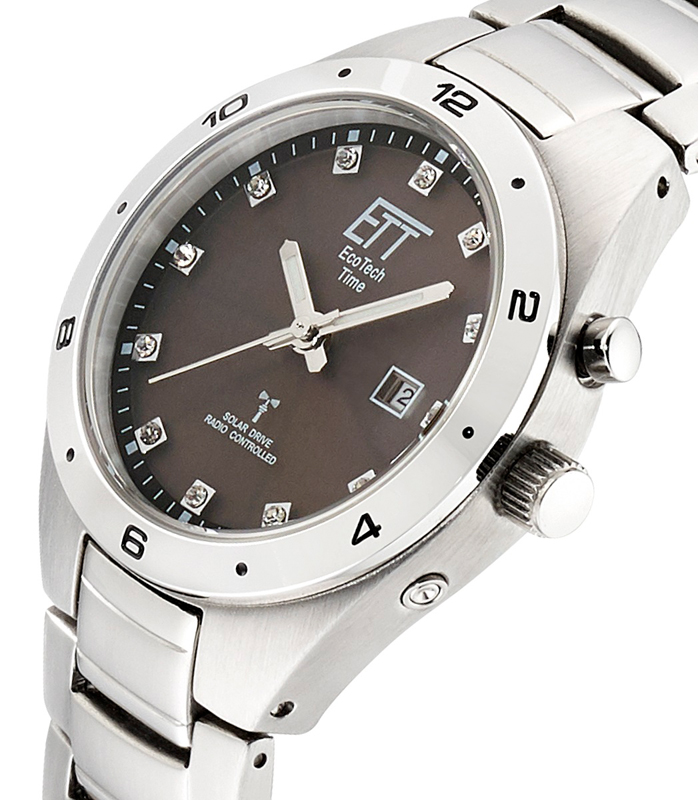 Eine sportlich elegante Damenuhr mit dunkelgrauem Zifferblatt und Solar-Funk-Antrieb. Die Eco Tech Time Solar Drive ALTAI Damenuhr hat bis zu 6 Monaten Dunkelgangreserve. Das Gehäuse und das Armband der EcoTech Time Solar Drive Funk ALTAI sind aus Edelstahl.