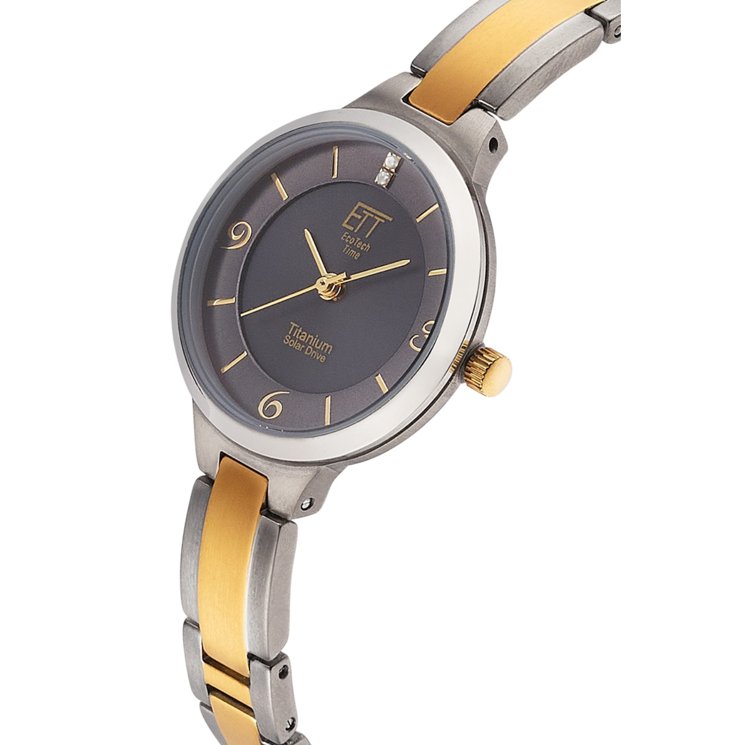 Diese aus Titan gefertigte Solaruhr für Damen ist mit einem zweifarbigen Armband ausgestattet und bis 5 Bar wasserdicht. Auf dem grauen Zifferblatt befinden sich zwei funkelnde Diamanten.