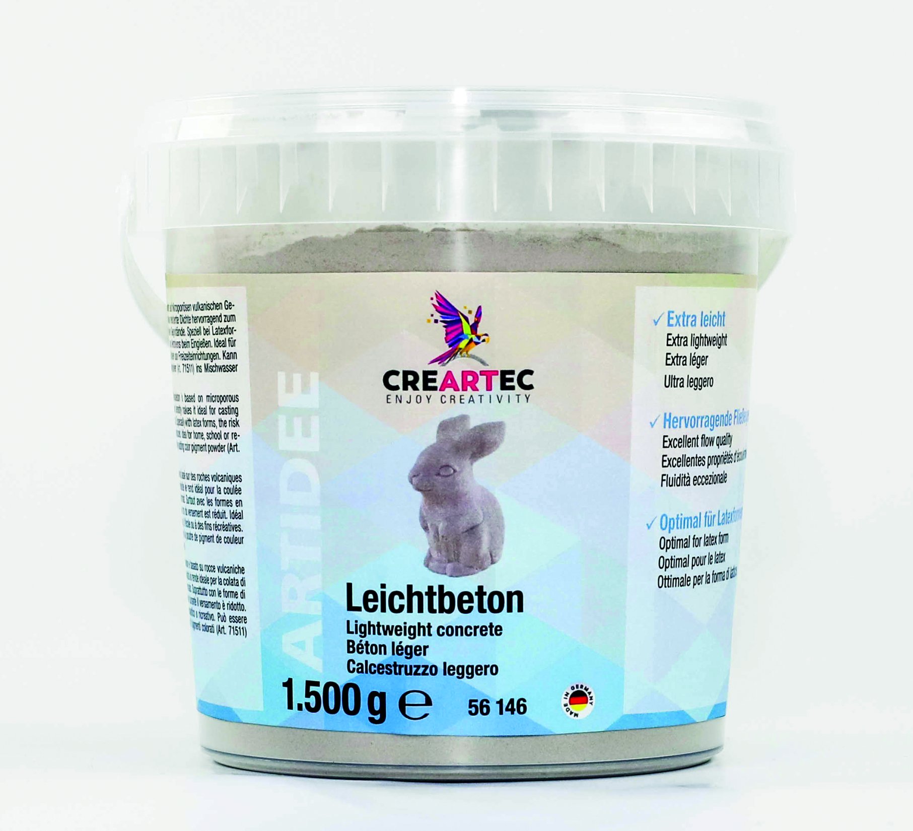 Leichtbeton besteht aus Puzzolanen und mikroporösen vulkanischen Gesteinen. Speziell bei großen Gießobjekten oder bei der Verwendung von Latexformen ist Leichtbeton unschlagbar. Leichtbeton-Objekte können nach dem Gießen mit unserem Farbkonzentrat bemalt werden. Weiterer Vorteil: Leichtbeton ist witterungsbeständig!