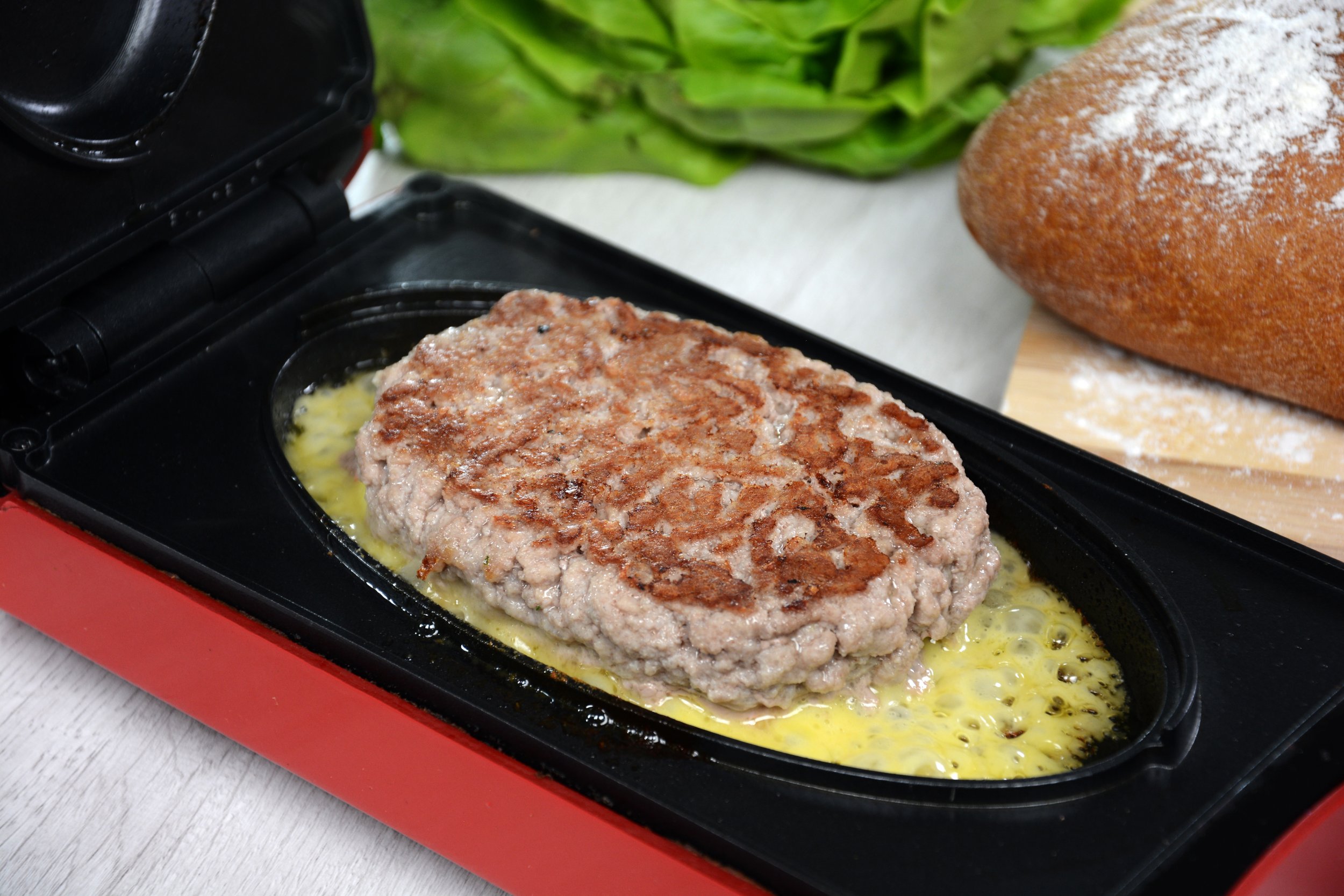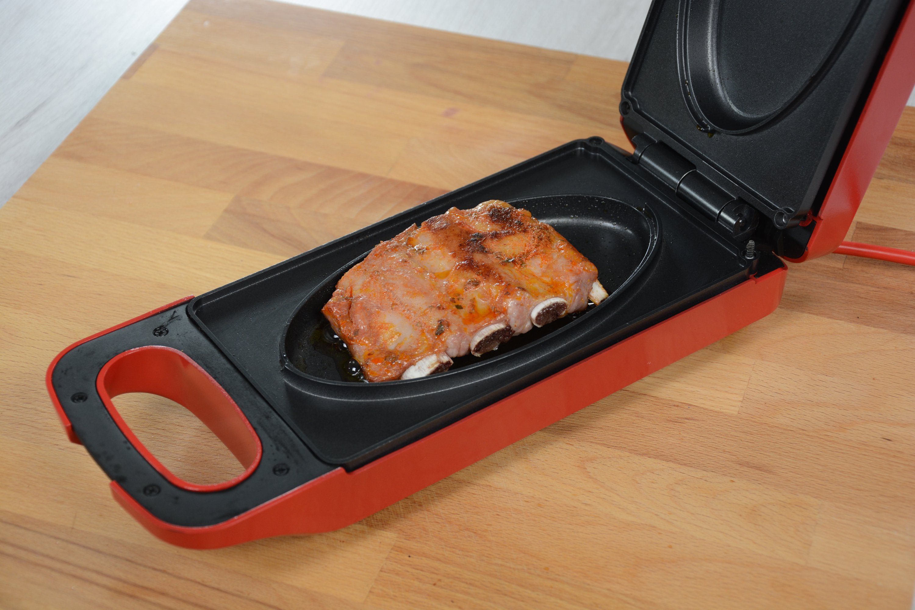 • Kontaktgrill für Zuhause mit zwei beschichteten Platten.