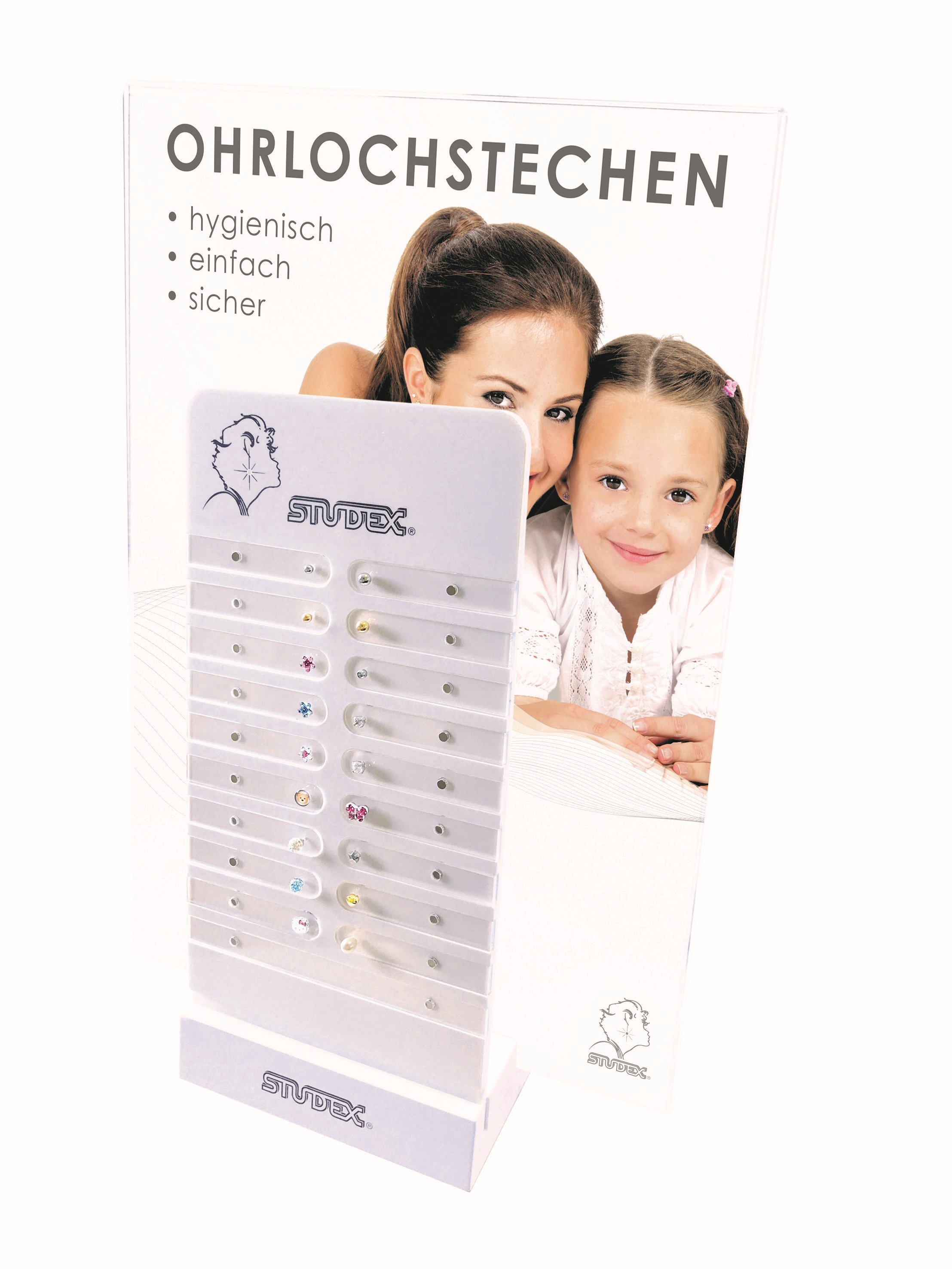 Studex System 75 Display "Peggy" mit 18 Ohrsteckern (Bestseller) auf herausnehmbaren transparenten Kunststoffträgern, A4-Display, Spiegel und Bodenplatte.