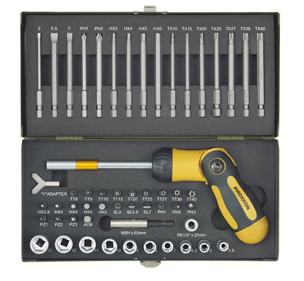 Produktinformationen "PROXXON Schraubersatz mit knickbarem Ratschen-Schraubendreher und Magnethalter, 54-teilig"
