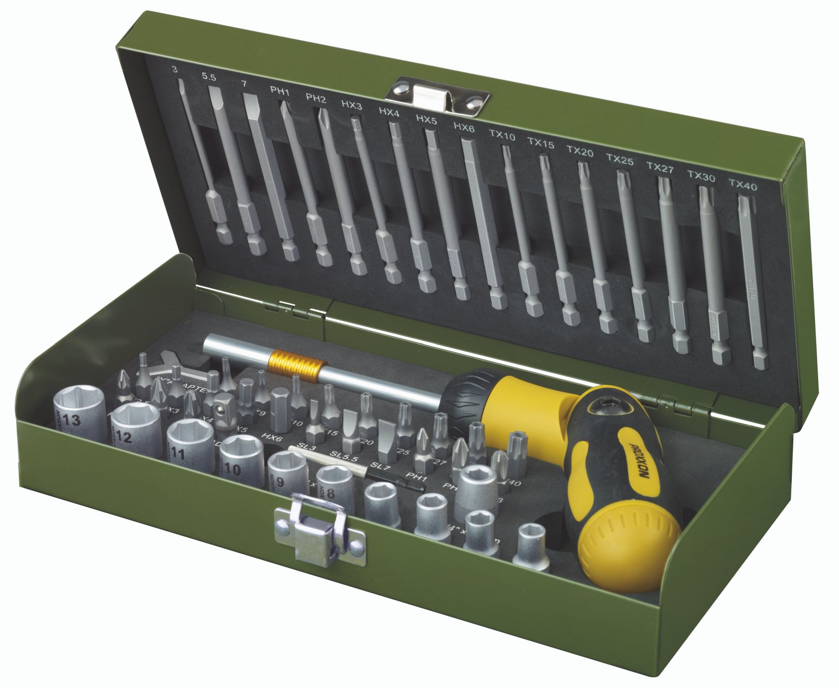 23 Bits 1/4" (6,3 mm) in Standardlänge (25 mm) und 16 Bits extralang (80 mm) für Sacklöcher. Adapter mit Außenvierkant und Außensechskant (male) sowie das Gegenstück mit Innenvierkant und Innensechskant (female). Spezialeinsatz zum zentrischen Spannen von Schraubhaken und ähnlichem. 10 Steckschlüsseleinsätze 1/4" von 5,5 - 13 mm. Dazu Magnethalter zum Arbeiten mit Elektroschrauber oder Bohrmaschine. In stabilem Stahlkasten (pulverbeschichtet).
