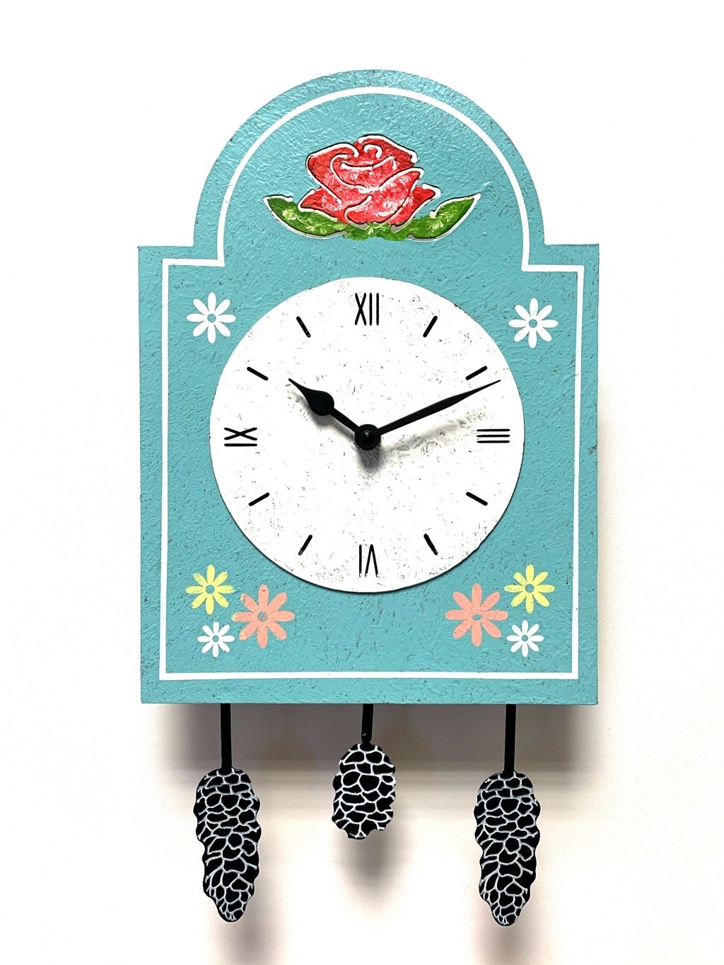 • Wanduhr aus Metall, handbemalt, ausgestattet mit einem hochwertigen, geräuschlosen UTS Quarzuhrwerk mit Pendelfunktion, made in Germany.