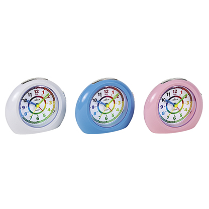 Quarzwecker, schleichende Sekunde, Repetition, Licht, Crescendo, seitlicher Alarmschalter, buntes Lernzifferblatt, bunte Zeiger