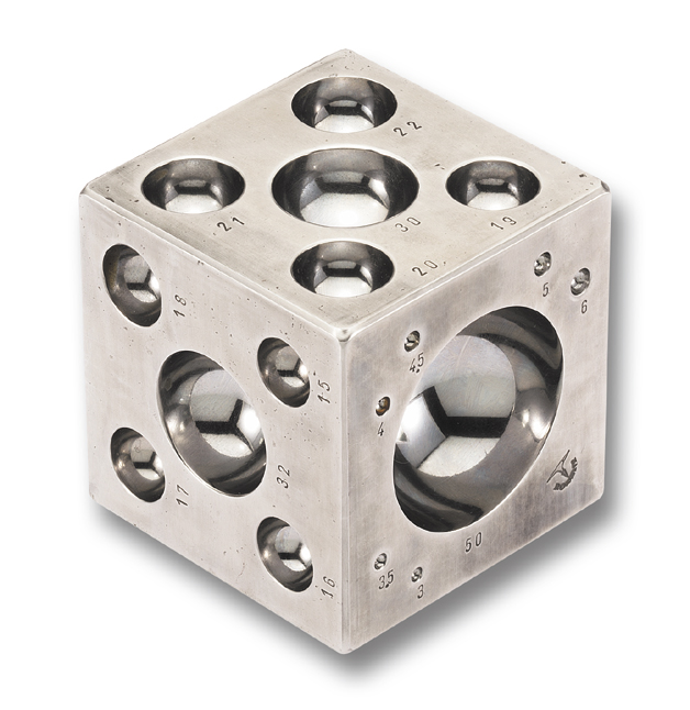 Mit 32 hochglanzpolierten, halbkugeligen Gesenken Ø 3,0 bis 5,0 mm (je 0,5 mm steigend), 6,0 bis 26,0 mm (je 1 mm steigend), 28,0 bis 32,0 mm (je 2 mm steigend), 35,0 bis 50,0 mm (je 5 mm steigend).
