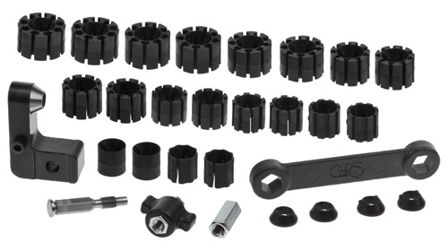 Bestehend aus: (1) ID-Ringhalter, (2) Sets à 10 Stück Spannhülsen, (2) Standardkonusse, (2) Konusse mit Spezialverzahnung, (1) Spannachse, (1) Spannmutter (1) Sechskantmutter sowie (1) GRS Sechskantschlüssel.