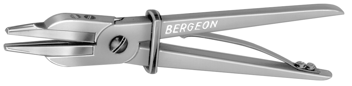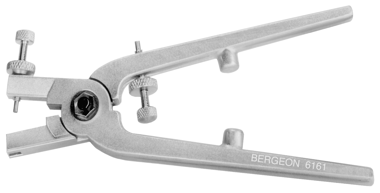 Aus Aluminiumguss. Zange zum Einpressen der Drücker und Korrektoren in Uhrgehäusen. Mit regulierbarem Anschlag und 2 Punzen (1,9 - 2,4 mm)