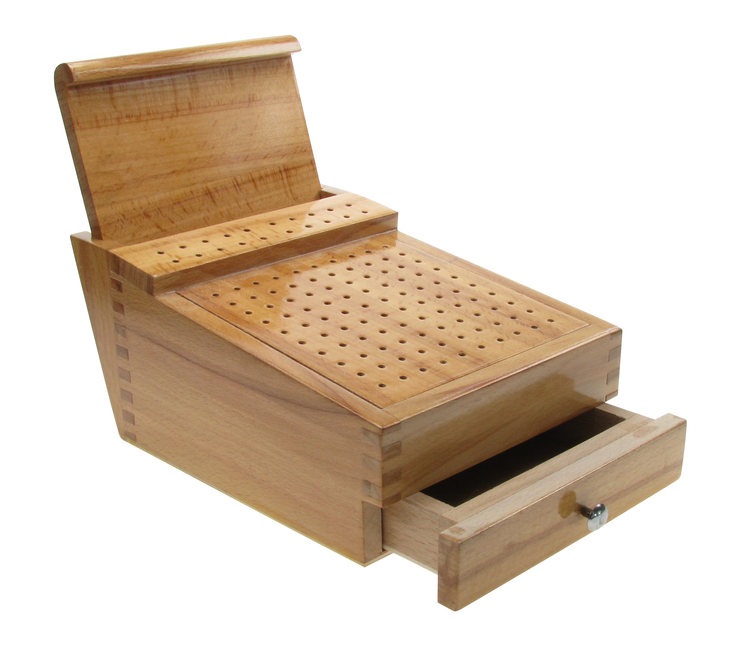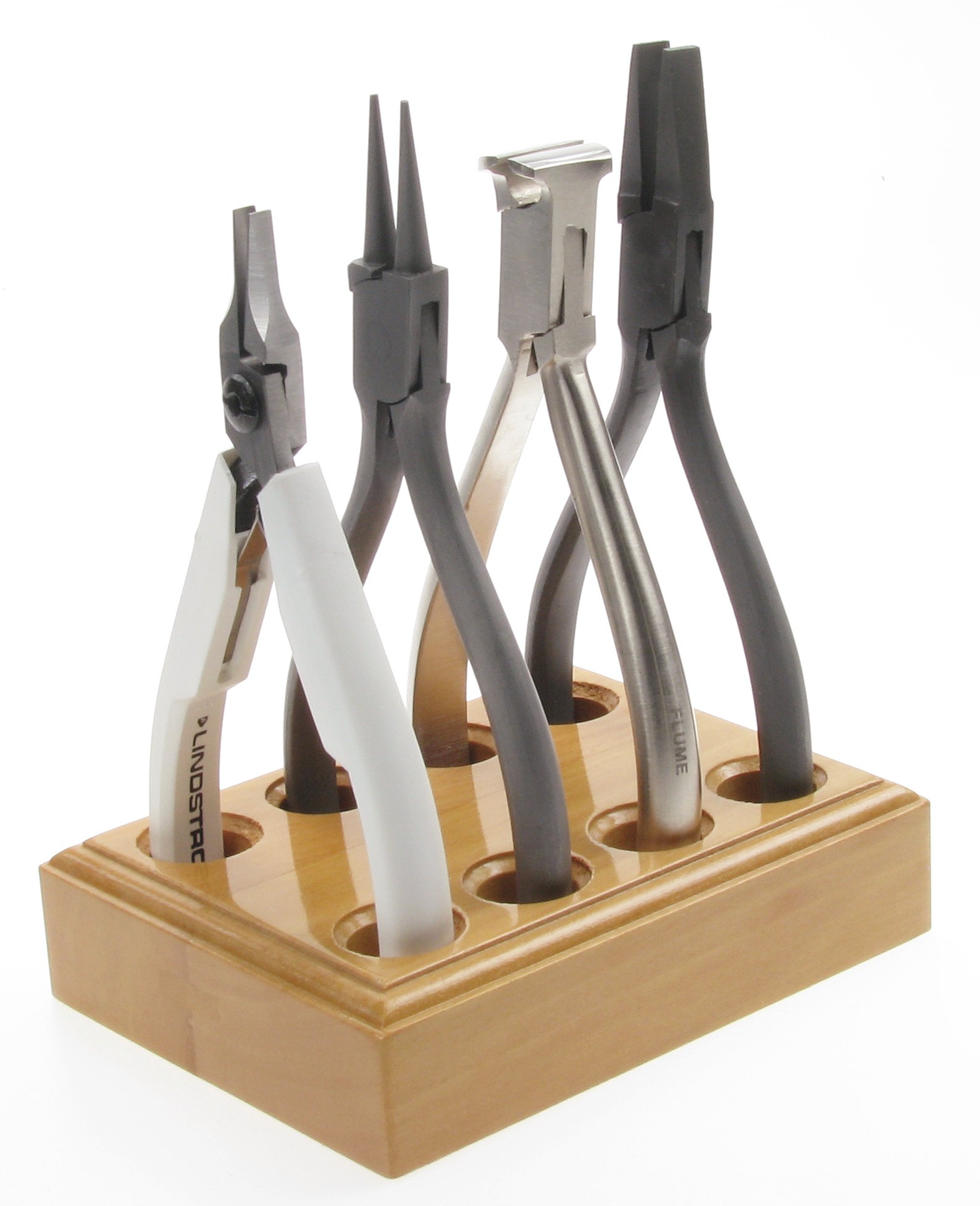 Lackierter Holzblock mit Bohrungen zur Aufnahme von Zangen. (Ohne Zangen)