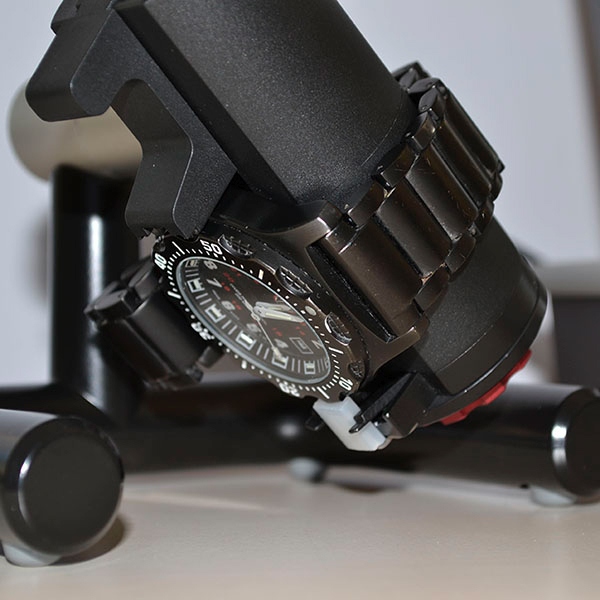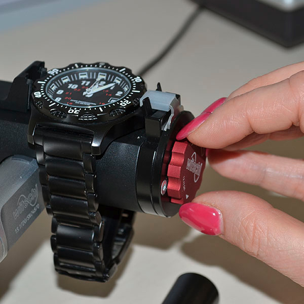 Der Vorteil des Niederhalters ist, dass Sie ihn an Ihrem Mikrofon belassen können. Auch wenn Sie feine, kleine Uhren oder Uhrwerke prüfen, bleibt der Niederhalter an Ihrem Mikrofon. Bei einer Prüfserie von gleichen Uhren arbeiten Sie zudem doppelt so schnell. Sie brauchen den Niederhalter nur einmal auf die zu prüfende Uhr justieren und können danach jedes weitere Werk direkt einspannen.