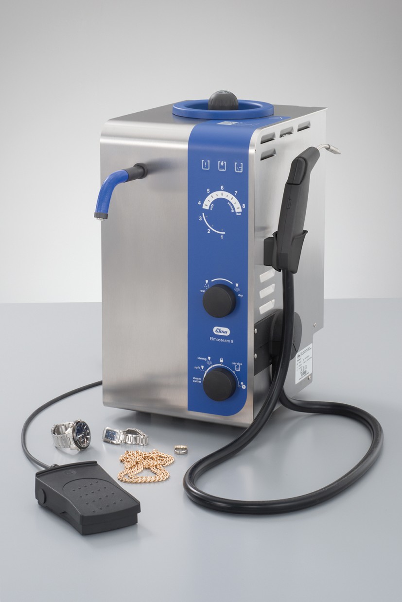 Das kompakte Elmasteam 8 Dampfreinigungsgerät eignet sich hervorragend zum Grob- oder Endreinigung von getragenem oder gelagertem Schmuck sowie für Uhrenbänder, Ketten oder Ringe mit gefassten Steinen.