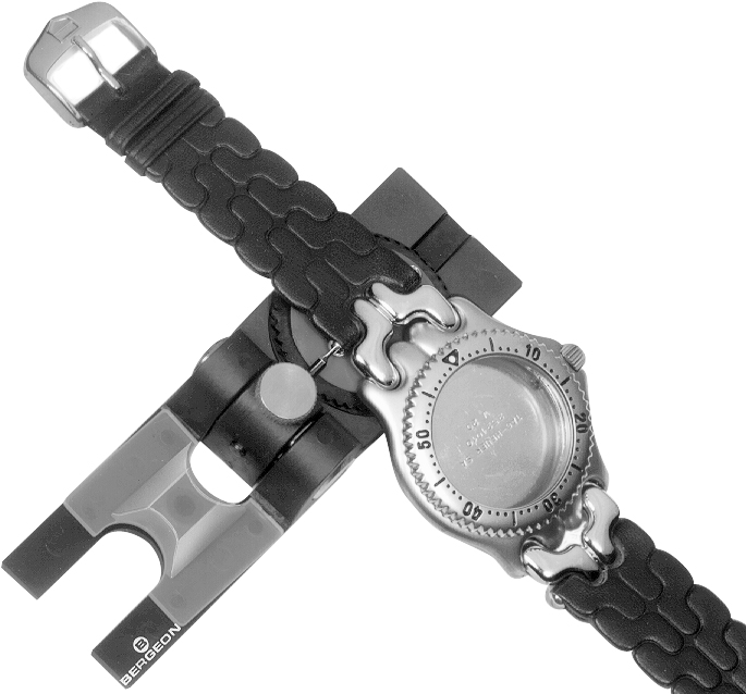 Die Uhr wird mit dem Band auf die Gummiplatte des Auflagetisches gelegt, der passend zur Armbanddicke in der Höhe verstellbar ist. Die Höhe des Tisches wird soweit reguliert, bis die eingesetzte Schraubendreherklinge mit der Schraubenachse am Band übereinstimmt. Der obere Teil des Halters wird mit leichtem Druck auf das Band geklappt. Mit einem Schraubendreher kann die Schraube auf der Gegenseite einfach verschraubt werden.