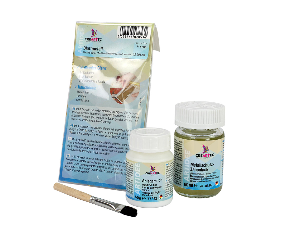 Comme alternative à l'or véritable, vous pouvez travailler avec des tôles bon marché: impact gold (Messin) ou aluminium / argent. Étonnamment, vous n’avez pas besoin de beaucoup d’outils et de matériel pour vous lancer dans la dorure. Avec les minces feuilles métalliques, vous créez des surfaces métalliques impossibles avec les peintures et les laques bronze d’or.