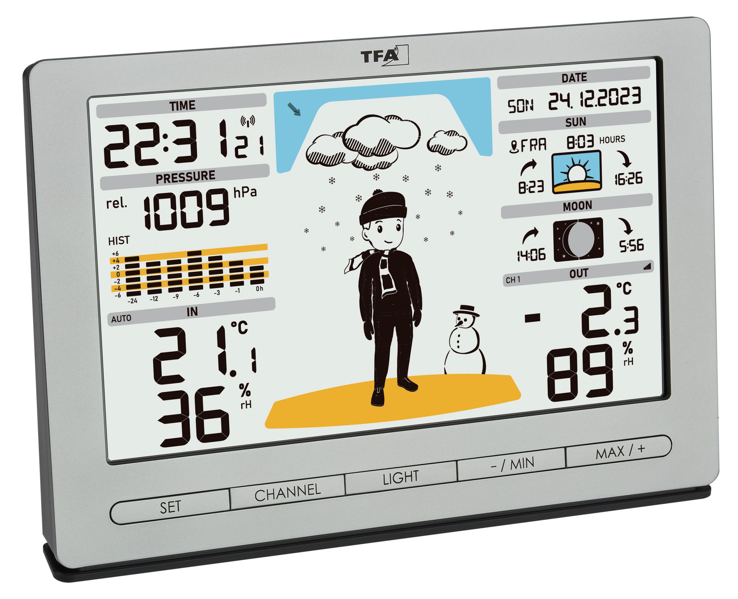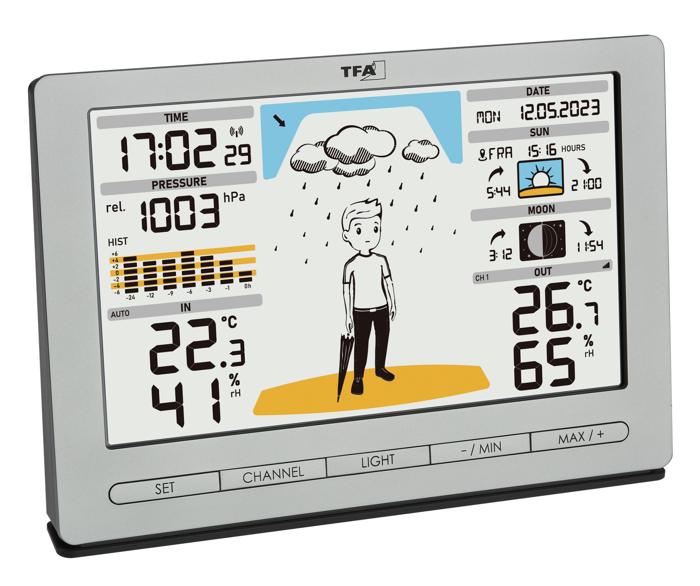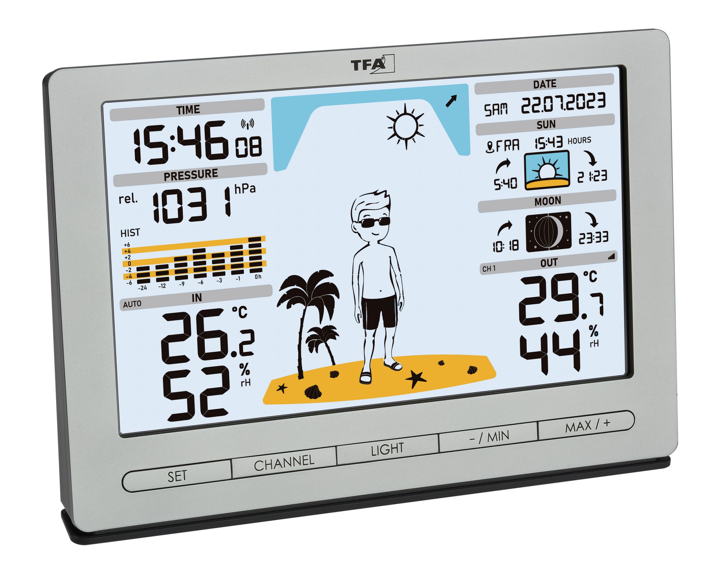 • Temperatur und Luftfeuchtigkeit für innen und außen (kabellos)