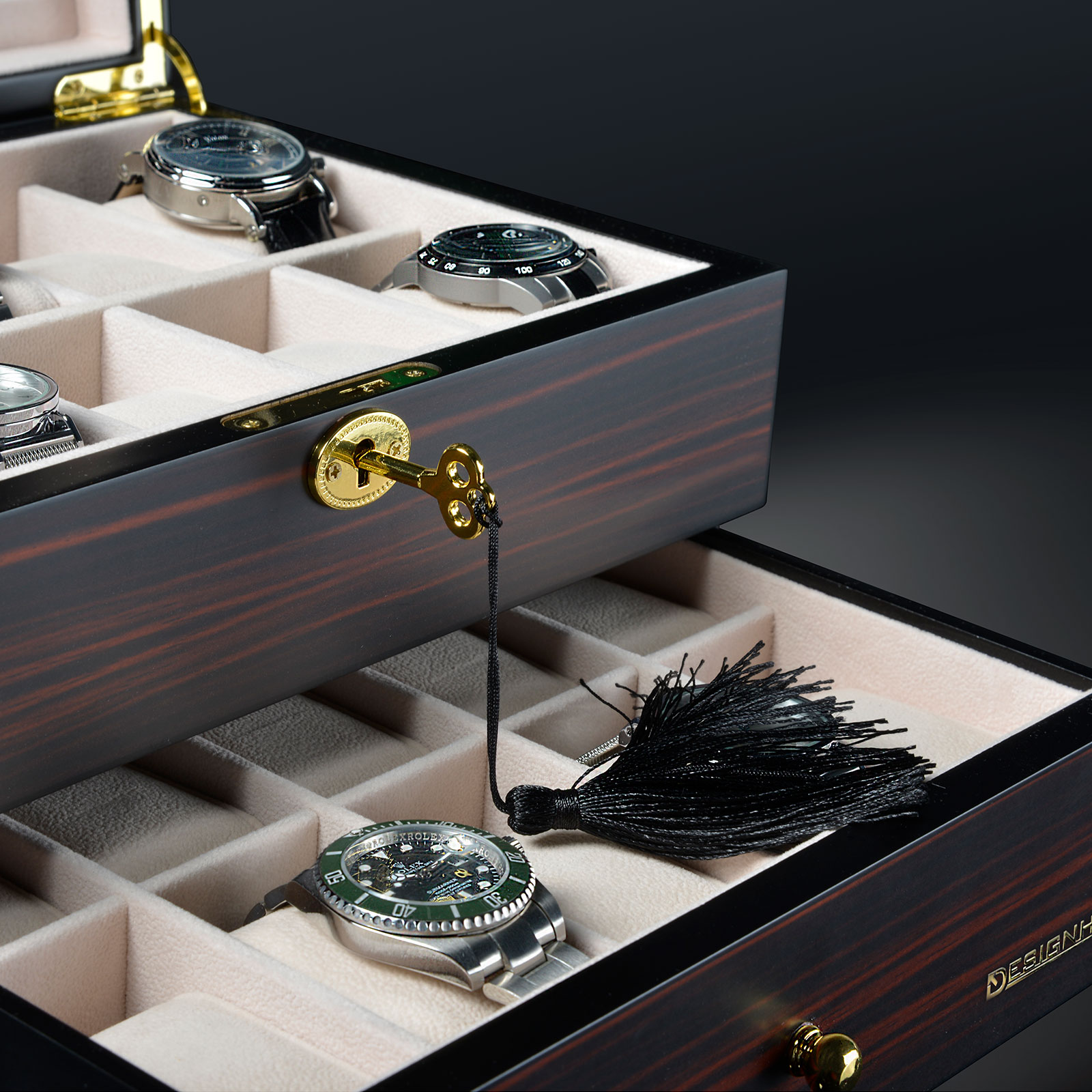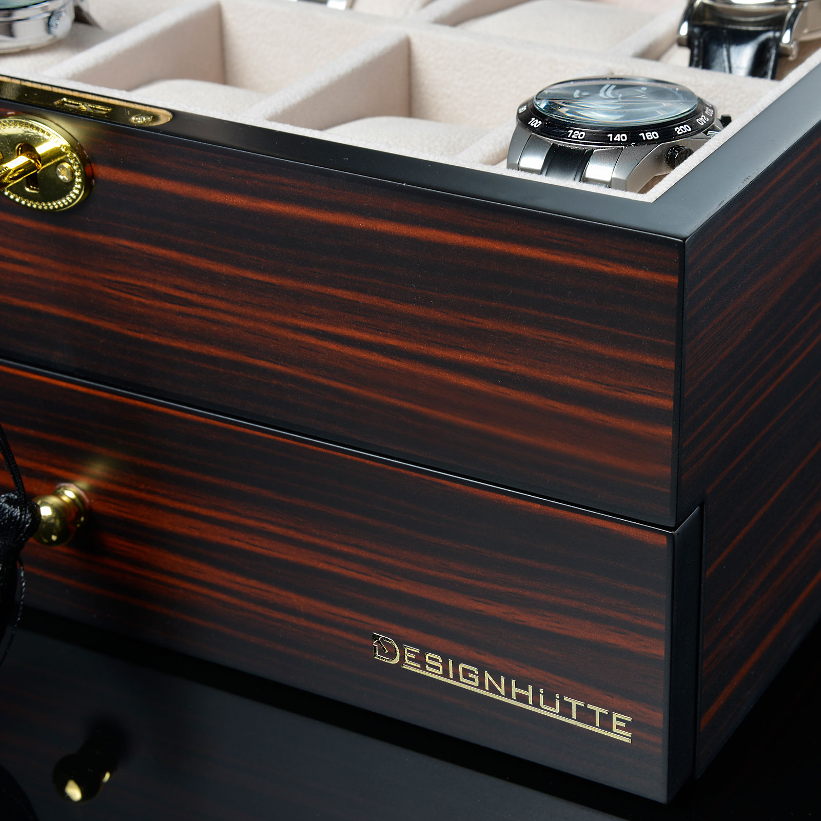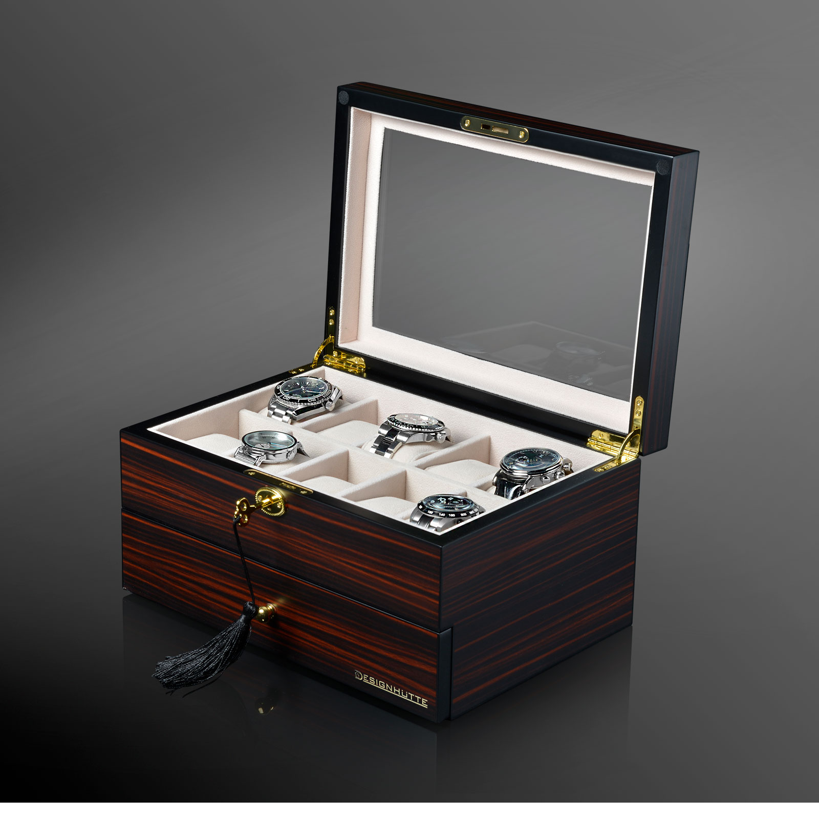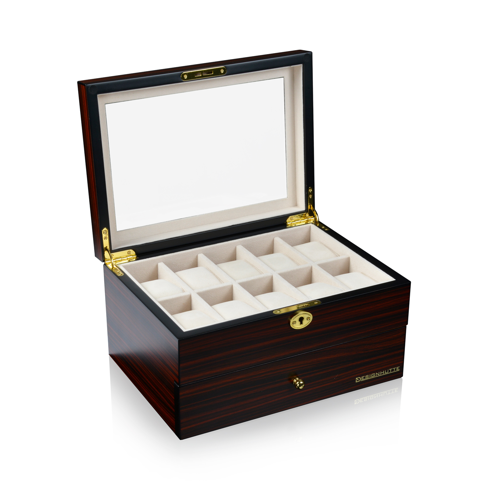 Le coffret à chronomètres de haute qualité Auckland de la marque Designhütte pour jusqu'à vingt chronomètres convainc par son design classique et élégant. Le boîtier verrouillable est fabriqué en placage de bois noble. La fenêtre encastrée vous offre à tout moment une belle vue sur vos chers objets de collection. L'intérieur clair en velours doux donne à cette série un charme tout particulier.