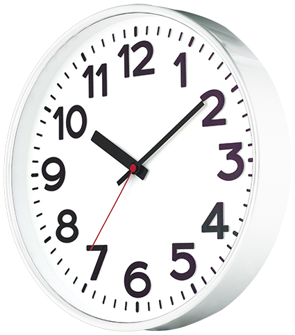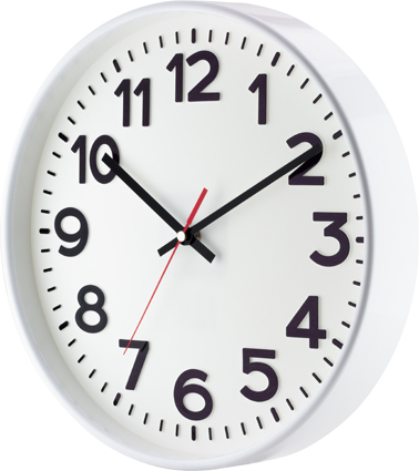Horloge murale radiocommandée silencieuse, blanche, avec chiffres en relief.